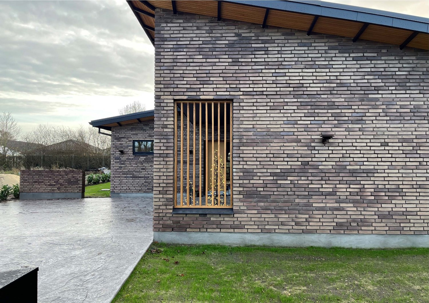 Den integrerede dobbelgarage har omvendt tagretning og et stortt udkraget udhæng som giver boligen lidt kant.