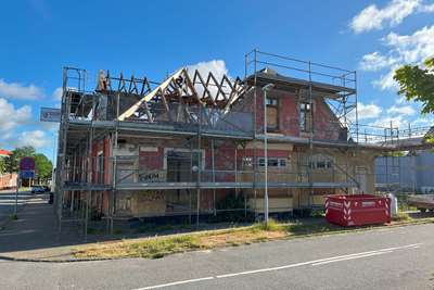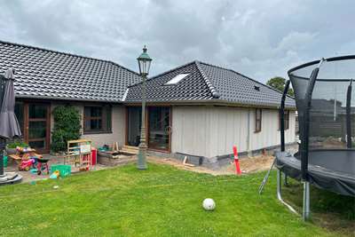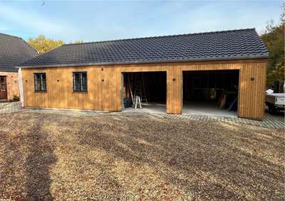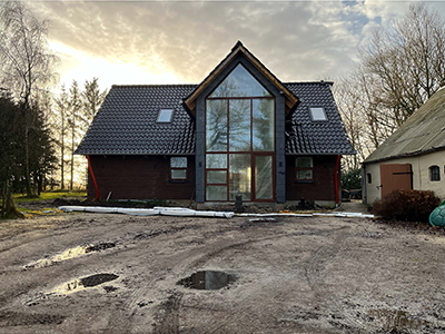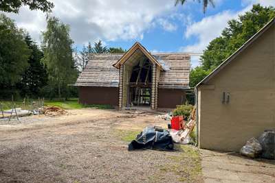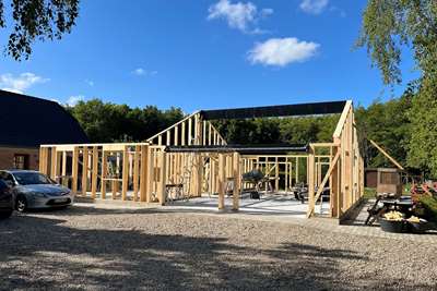 Til og ombygningen af den landejendom der blev påbegyndt i maj mdr. er godt igang. Bygherren skal selv stå for en del af arbejdet og det lokale tømrerfirma der var hyret til at rejse begge tilbygninger er færdige. Nu skal bygningen færdiggøres udv. med vinduer, tagdækning, tagrender og facadebeklædning. Begge de nye tilbygninger skal beklædes med kløvede naturskifter.og der skal monteres mahogni vinduespartier som i den eks. bygning.