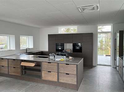 I huset store centrale køkken/alrum er der lofter til kip for at tilgodese den helt unikke udsigt og som ligeledes lukker masser af dagslys ind i rummet. På kundens ønske har vi har lavet en farvefilm på dette projekt.