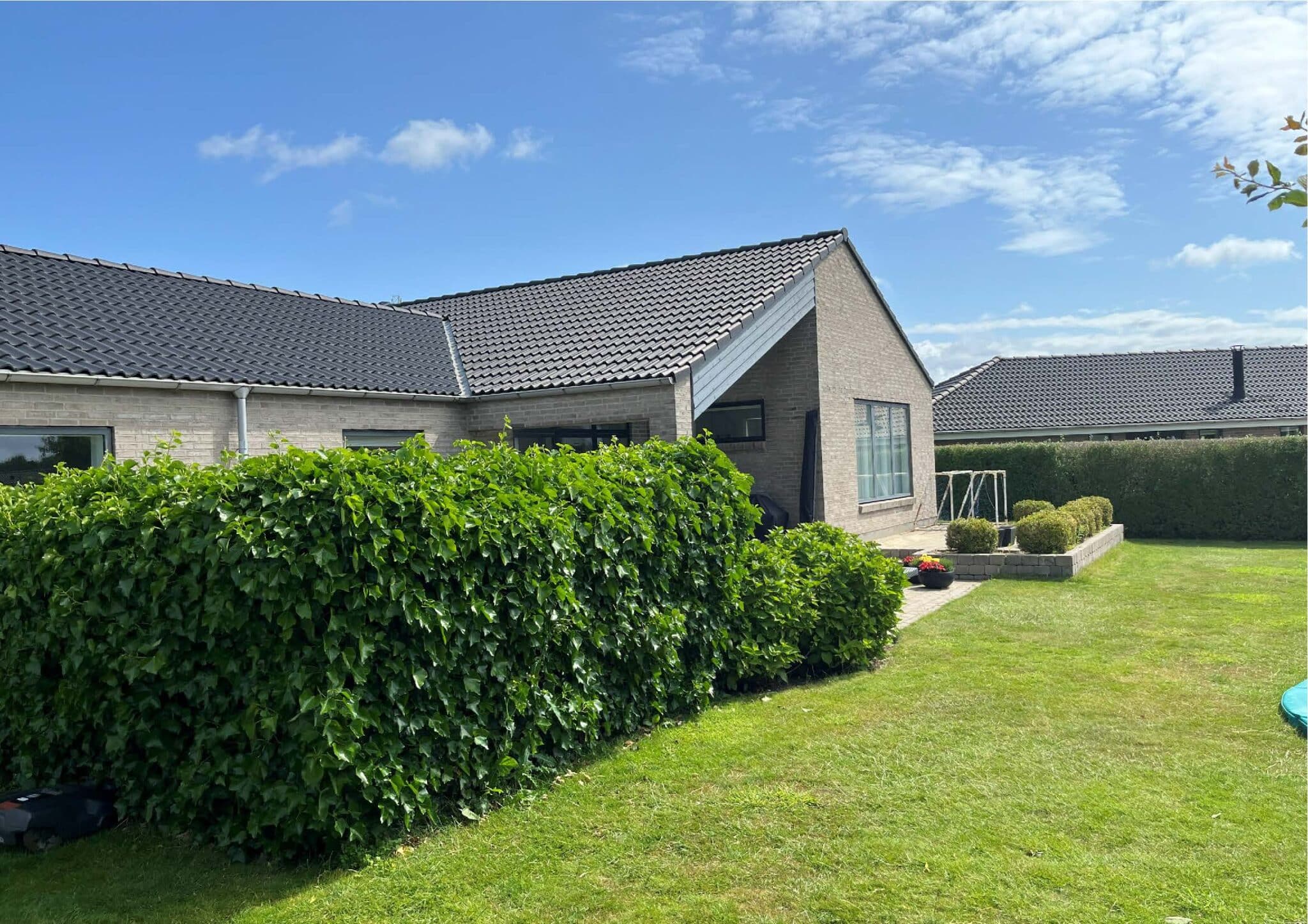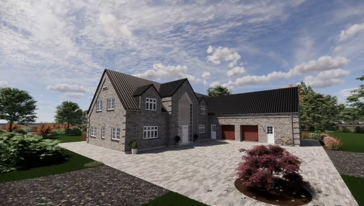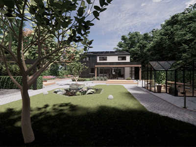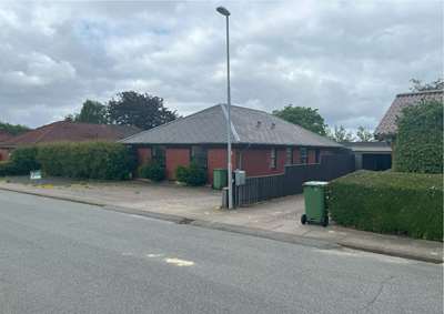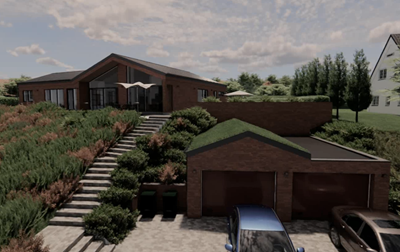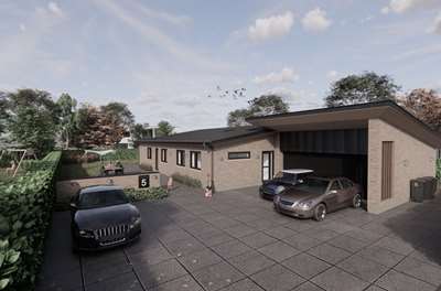 På en stor grund i Bramming har vores kunde ønske om at opføre et nyt énfamilieshus til sig selv og frastykke den resterende grund til en selvstændig matrikel hvor der senere skal opføres 2 fritliggende dobbelhuse.