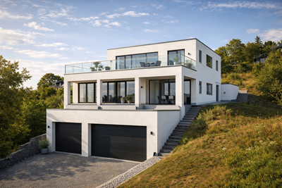 Vi har netop afleveret skitseforslag på en moderne funkis villa som skal indbygges i terrænet på en meget kuperet naturgrund på den Jyske Østkyst. Fra den øverste tagterrasse er der 180 graders panorama udsigt over århusbugten og fra de store vinduespartier i stueplanet er der udgang til en stor overdækket terrasse med næsten den samme udsigt.