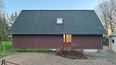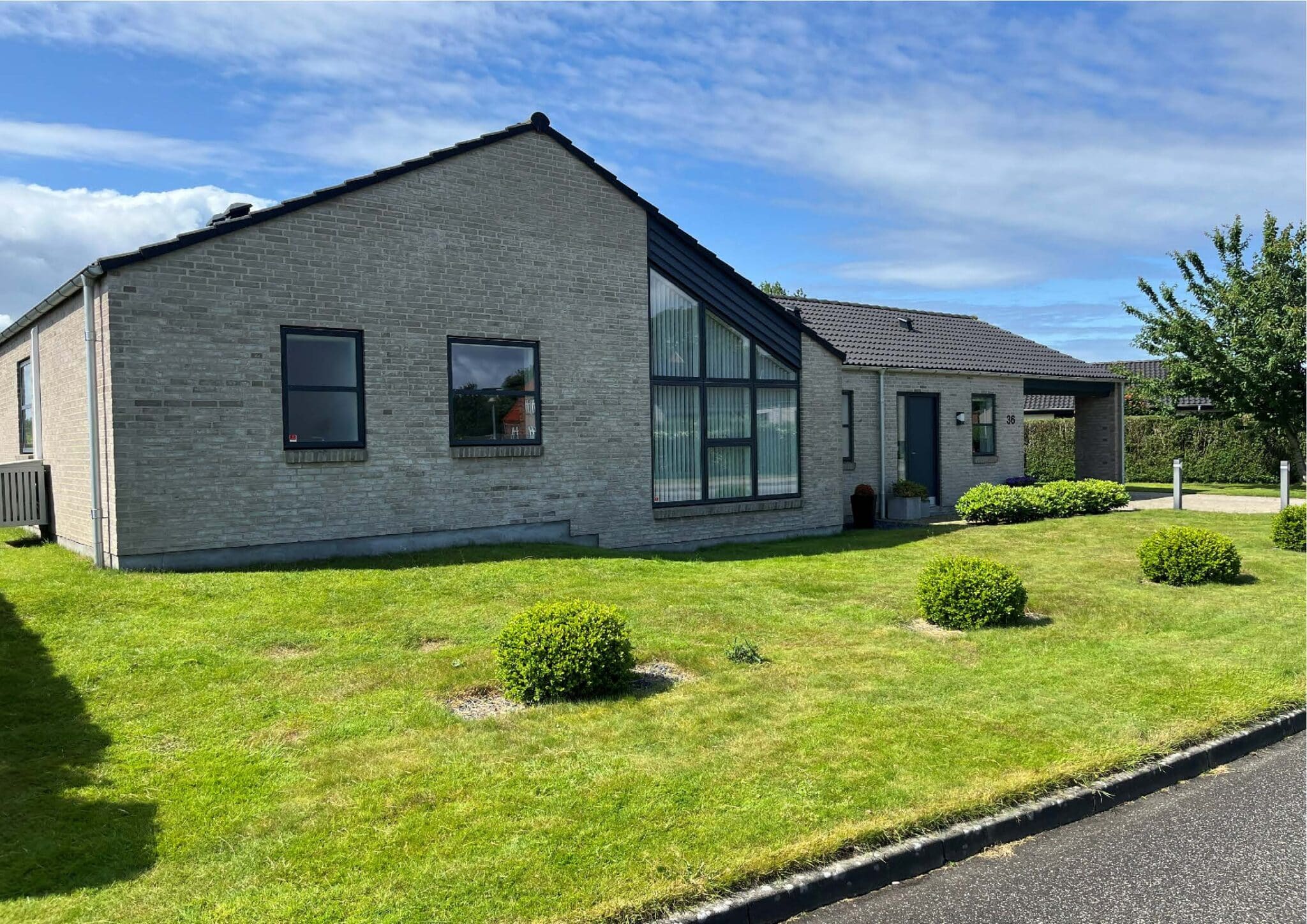 Nu begynder man at kunne se forvandlingen af den landejendom vi projekterede 2 tilbygninger på i februar måned. Hvor indgangssiden imod gårdspladsen før var meget tillukket fremstår facaden nu med meget mere wauw effekt samtidig med at der bliver lukket meget dagslys ind gennem bygningen som netop var én af kundens kardianlpunkter ved idémødet. De nye tilbygninger er begge beklædt med kløvede naturskifer som står utroligt godt op mod de originale brune teglsten og mahogny vinduerne.