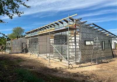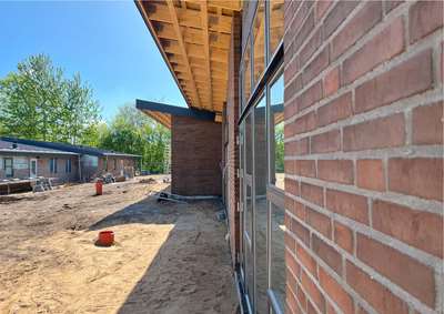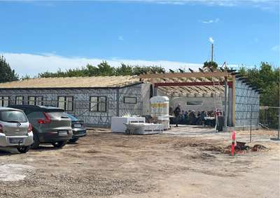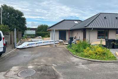 Byggeriet af det spændende énfamilieshus i Bramming vi projekterede i efteråret 2024 skrider planmæssigt fremad og der har netop været holdt rejsegilde i flot solskinsvejr. Der er nu monteret vinduer og hulmursisoleringer er ligeledes monteret.
