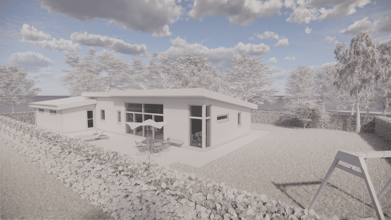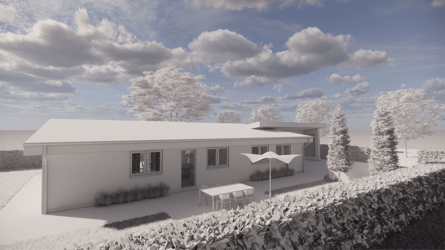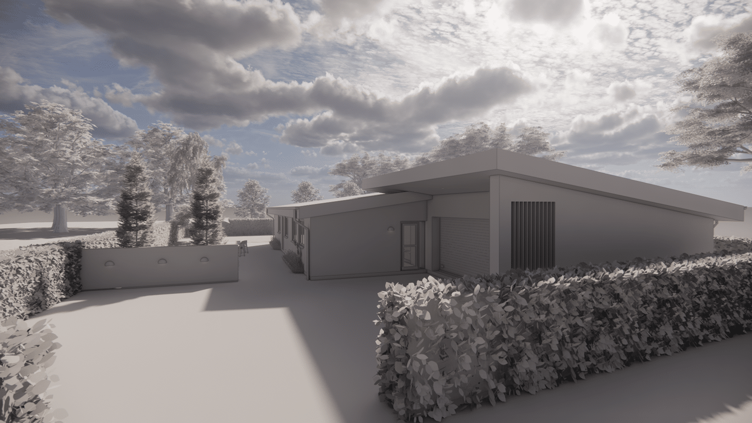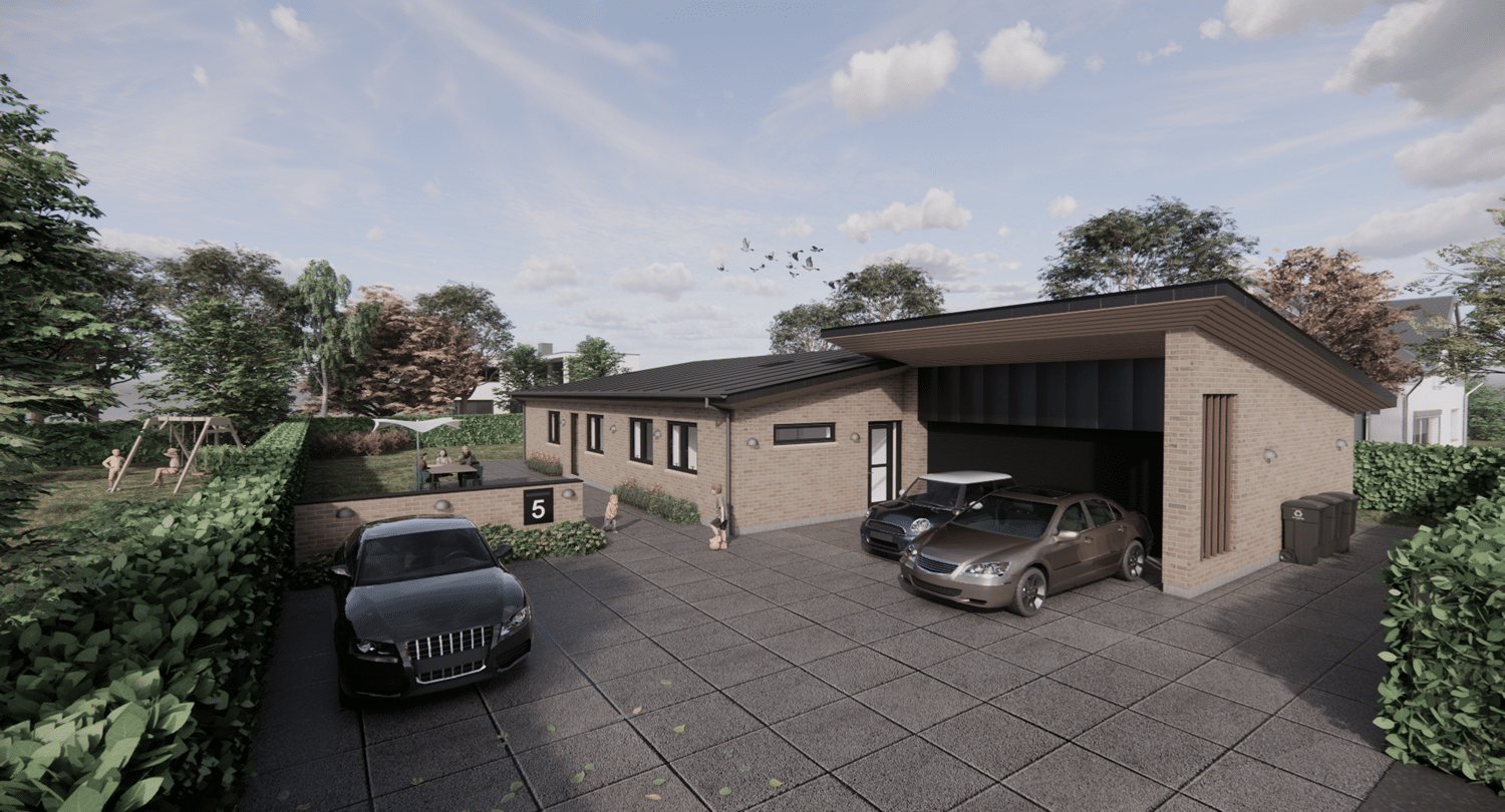 På den resterende del af grunden er det meningen at der skal opføres 2 fritliggende dobbelhuse. Kravet til den nye bolig var at den ikke måtte være mere end omkring 130 m² brutto boligareal + en integreret dobbelgarage. Vi har tegnet en lille egoistbolig med et stort centralt køkken/alrum & opholdsstue med skrå lodter og et dejlig lysindfald. Boligen indeholder herudover en voksen afdeling med eget toilet & bad samt et påklædningsværelse