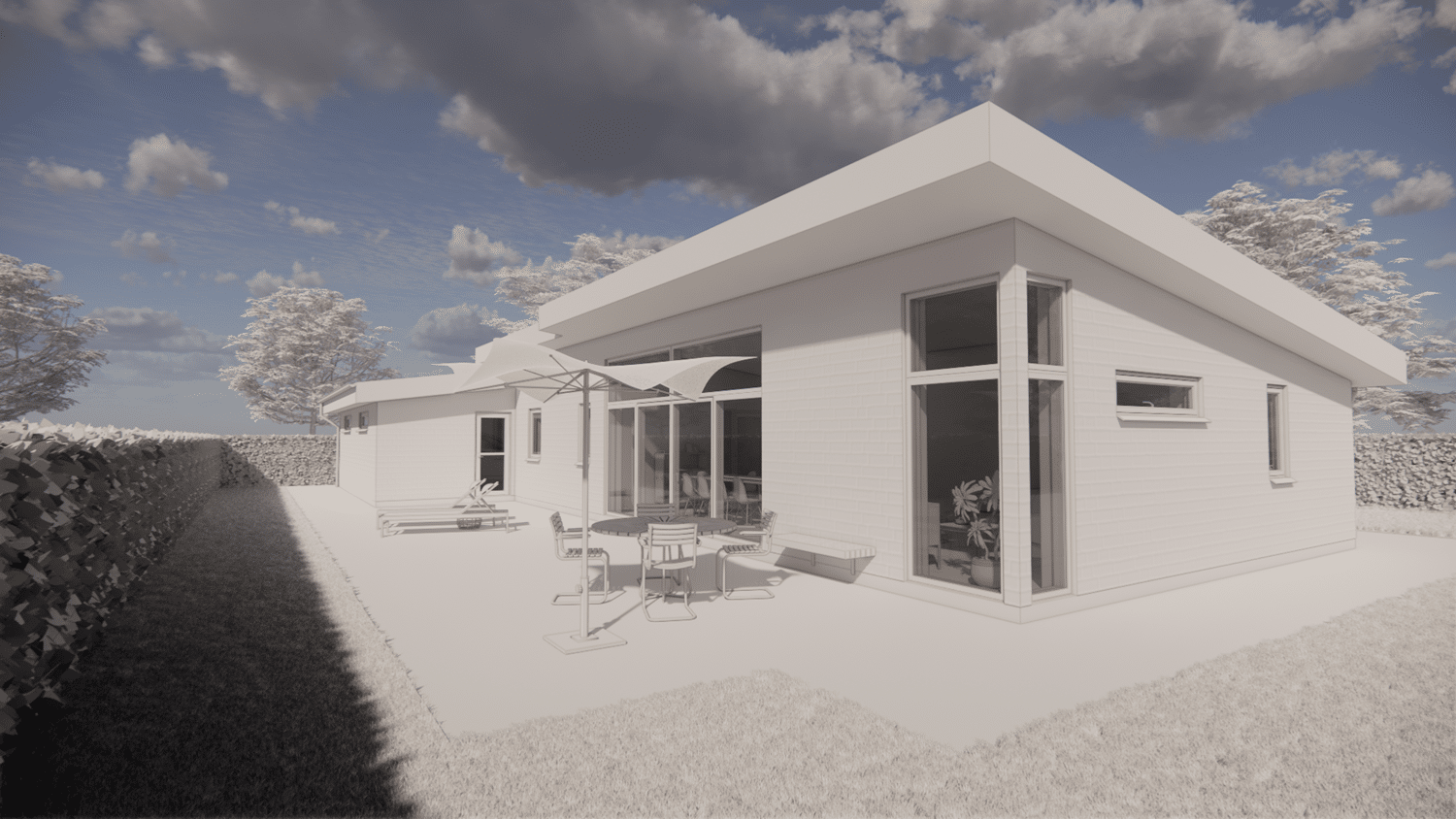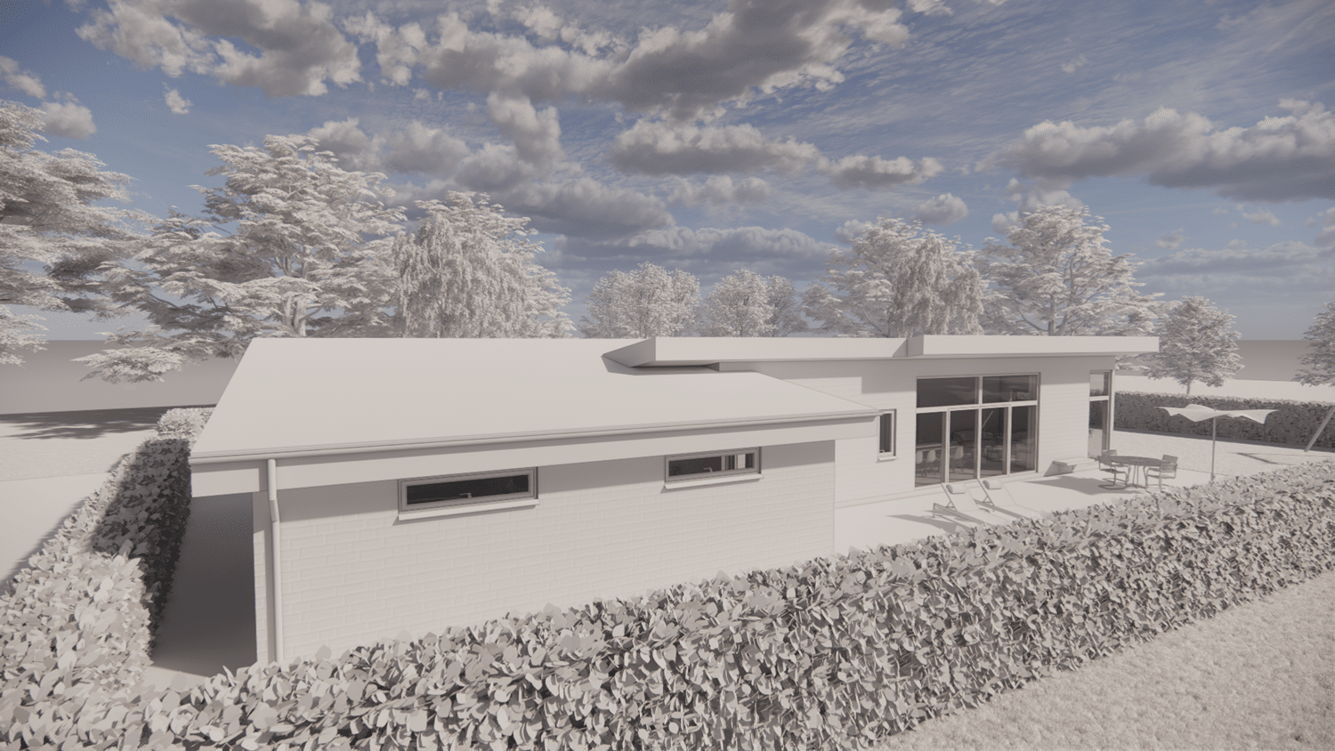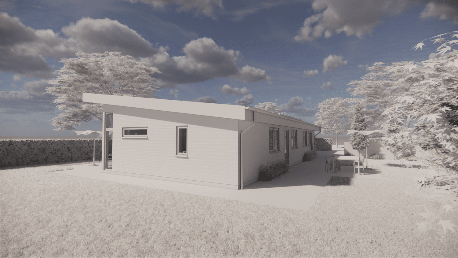 På den resterende del af grunden er det meningen at der skal opføres 2 fritliggende dobbelhuse. Kravet til den nye bolig var at den ikke måtte være mere end omkring 130 m² brutto boligareal + en integreret dobbelgarage. Vi har tegnet en lille egoistbolig med et stort centralt køkken/alrum & opholdsstue med skrå lodter og et dejlig lysindfald. Boligen indeholder herudover en voksen afdeling med eget toilet & bad samt et påklædningsværelse