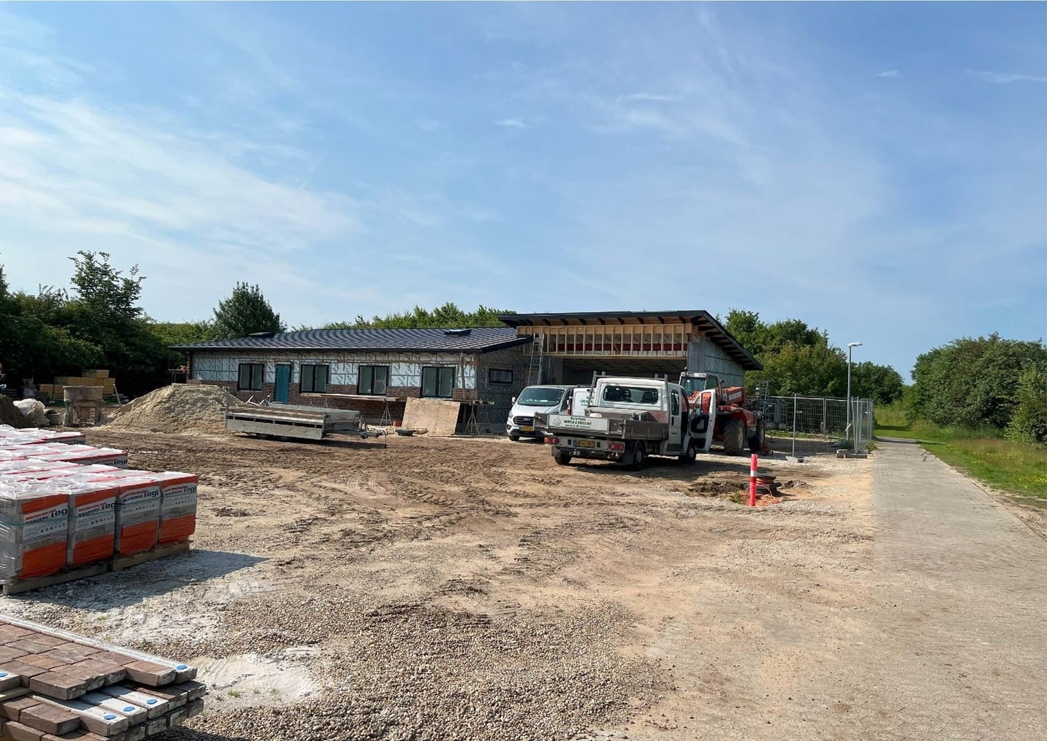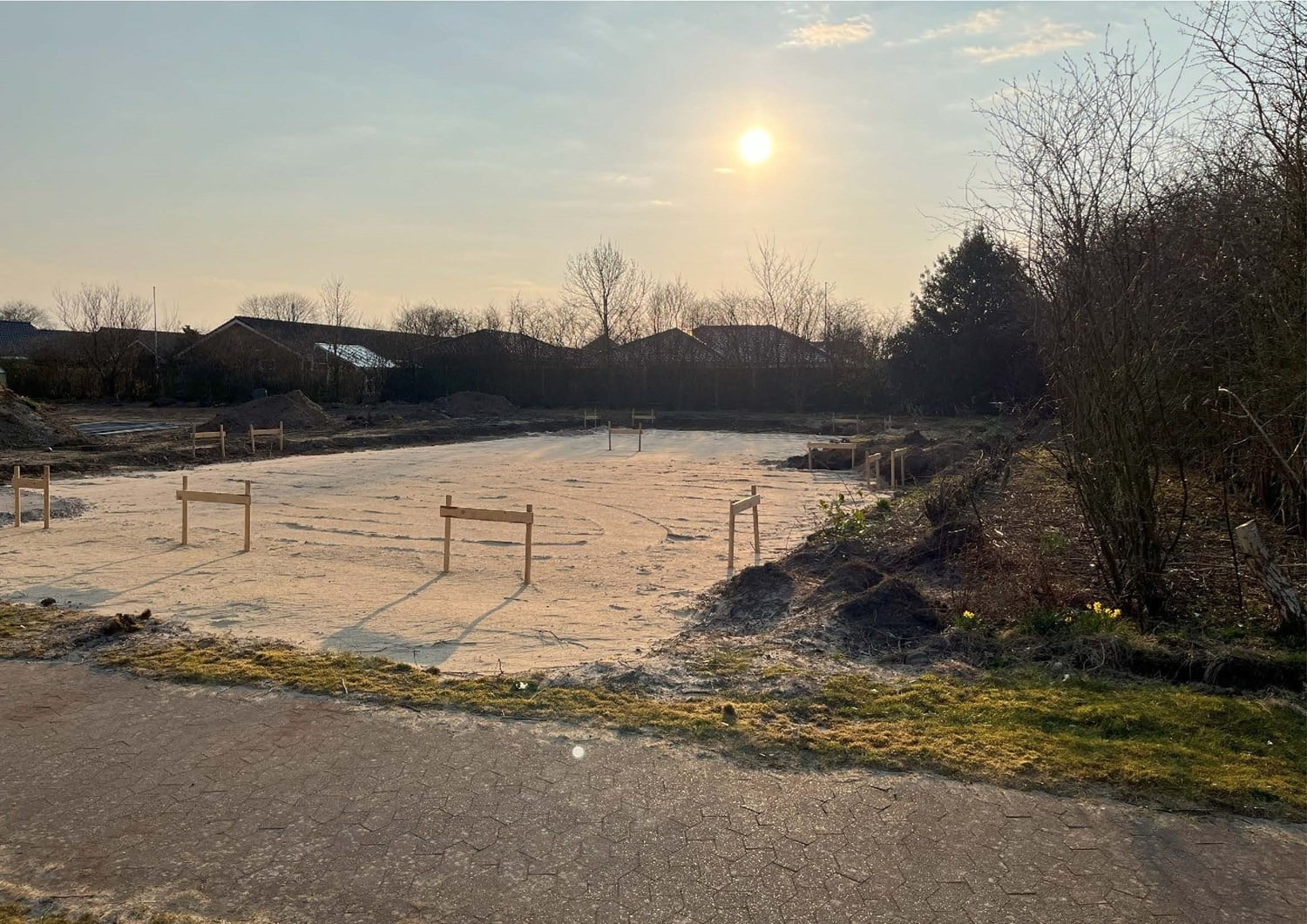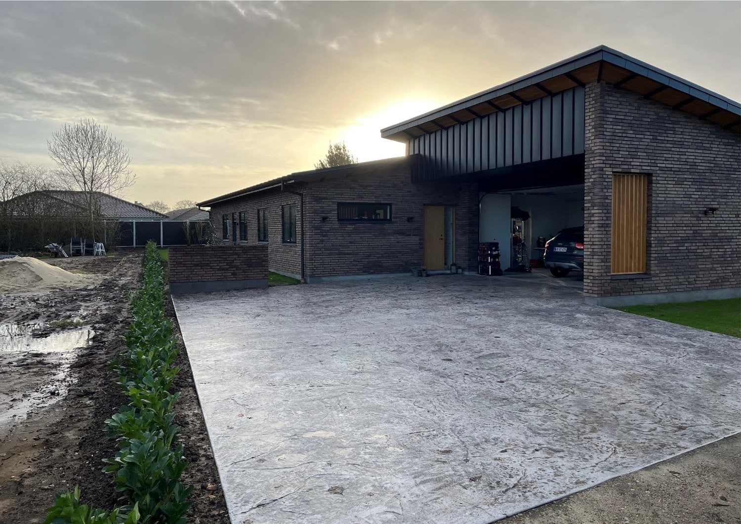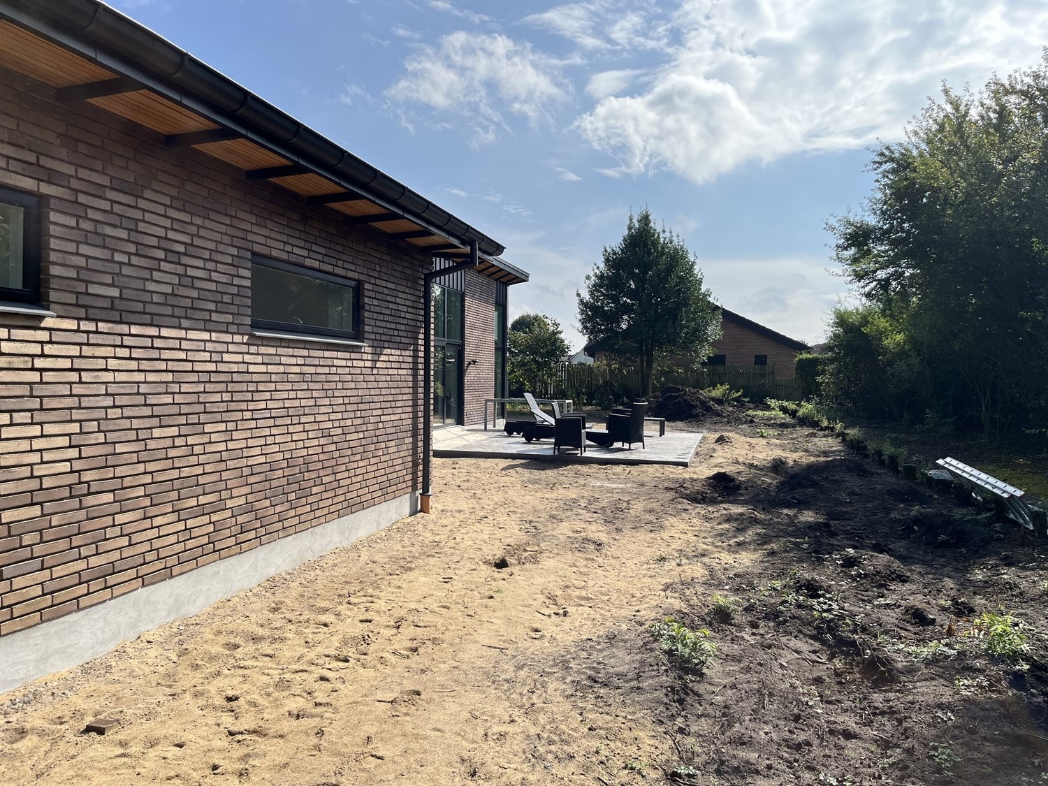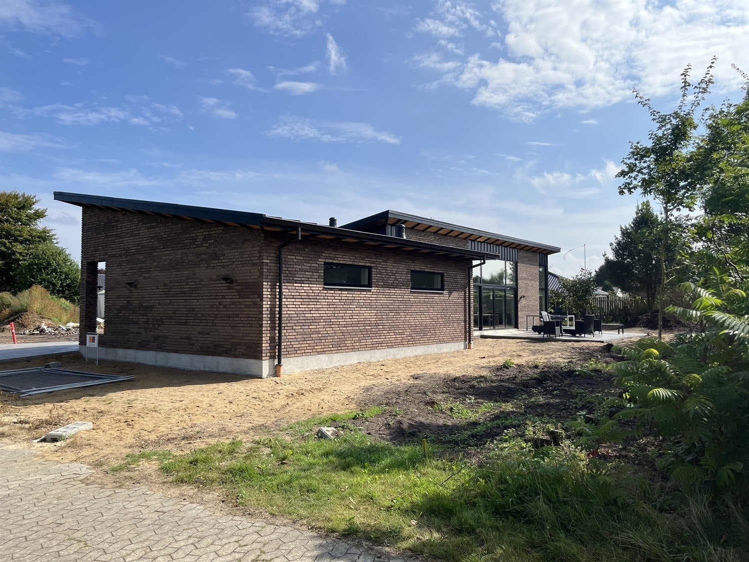 For enden af en blind vej i Bramming har vores kunde købt en større grund hvor der ligger en ældre ejendom på den nordlige del af grunden. Kunden der selv driver et større lokalt tømrerfirma har planer om at opdele matriklen i 2 selvstændige matrikler hvor der på den sydlige del af grunden skal opføres et nyt énfamilieshus som han selv skal bo i.