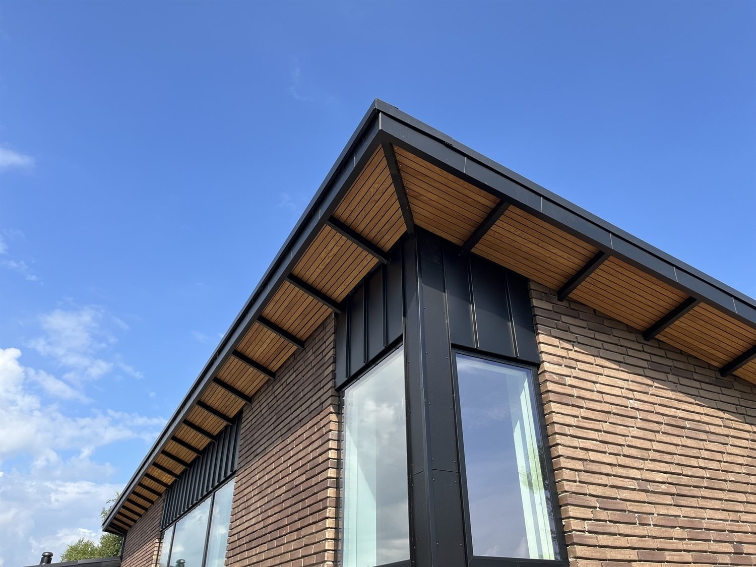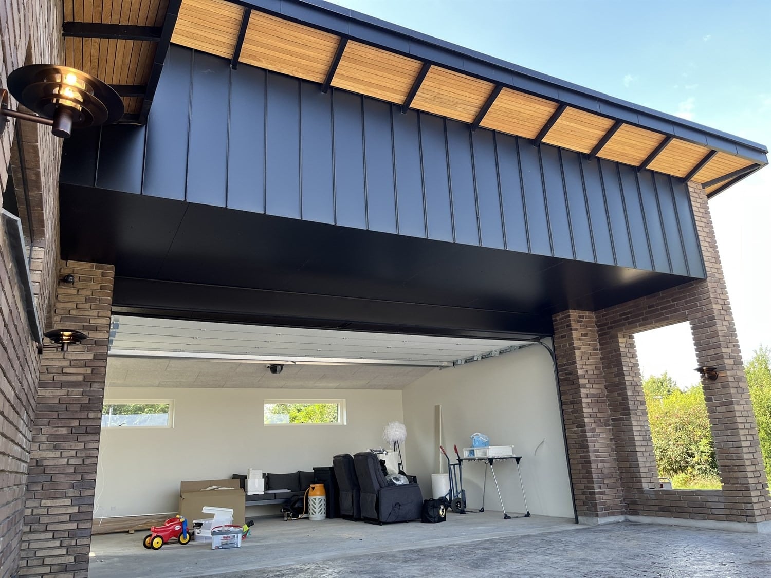 I den modsatte ende af huset er der 2 lige store værelser samt endnu et toilet og bad og et større bryggers hvor boligens tekniske installationer er placeret. Der er skrå lofter overalt i boligen hvilket giver en fantastisk rumfornemmelse og som ligeledes lukker masser af dagslys ind i rummende. Den integrerede dobbelgarage har omvendt tagretning og et stortt udkraget udhæng som giver boligen lidt kant.